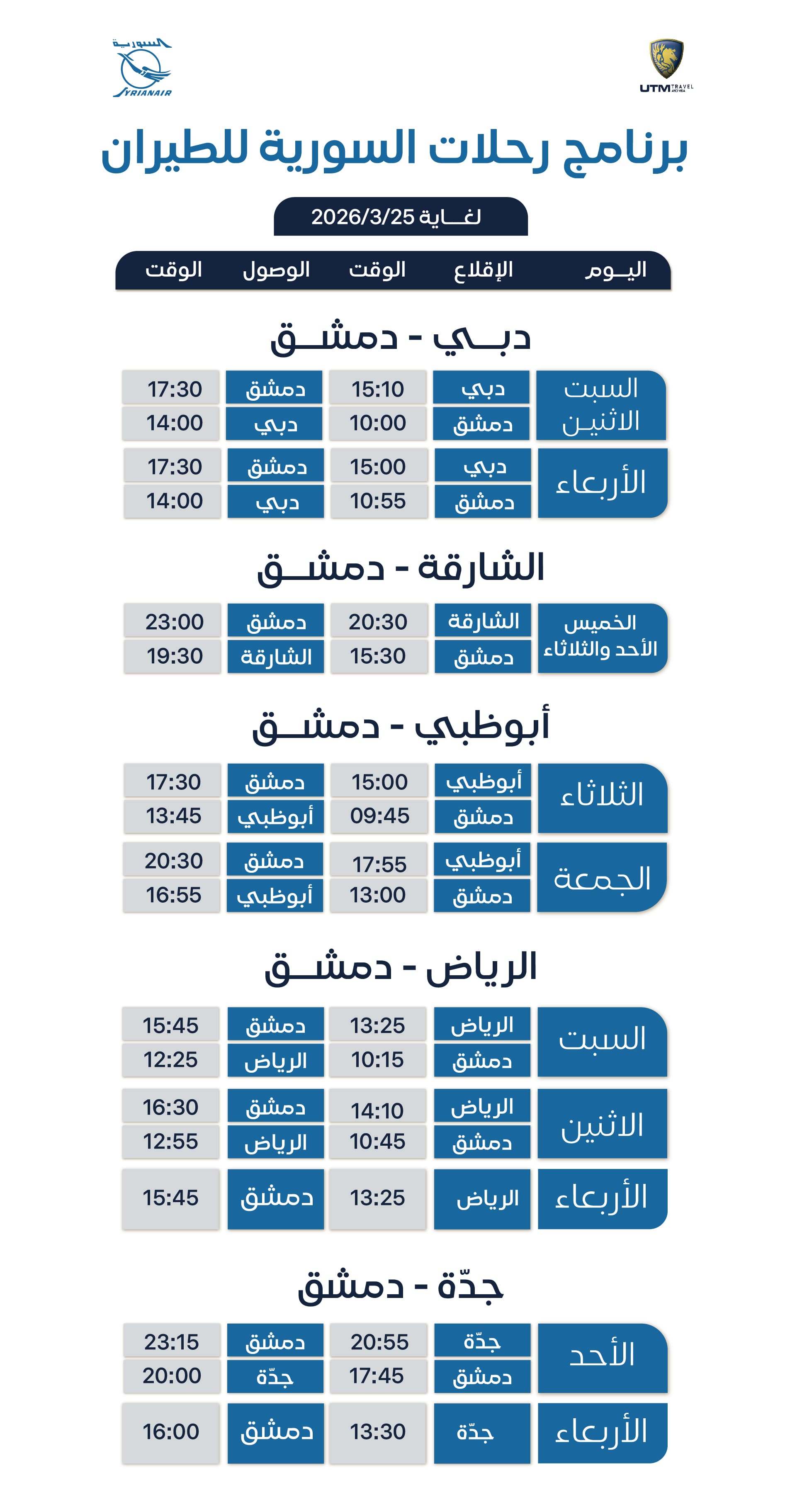السورية للطيران | برنامج الشتاء من 01/11/2025 لغاية 25/03/2026
